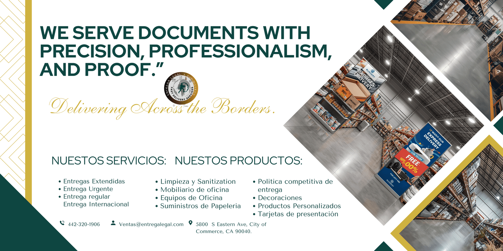Somos una empresa bilingüe de apoyo legal y suministros de oficina, comprometida con la rapidez, precisión y profesionalismo. Con sede en California, atendemos a clientes a nivel estatal, nacional e internacional. Nos especializamos en entrega de documentos legales, apoyo en corte y soluciones urgentes de oficina — desde banners personalizados hasta papel tamaño legal. Ya seas firma legal, emprendedor o particular, entregamos lo que necesitas, cuando lo necesitas.
